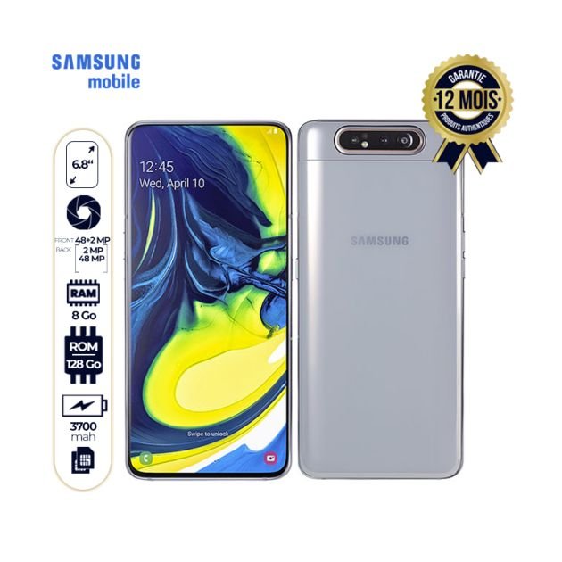 Le Samsung Galaxy A80 est un smartphone haut de gamme, moderne et performant, idéal pour ceux qui veulent fluidité, grand écran et photos de qualité, le tout à un prix compétitif.